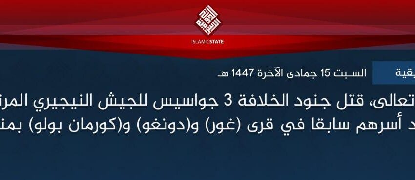 ولاية غرب إفريقية – بتوفيق الله تعالى، قتل جنود الخلافة عنصرا من الميليشيات الموالية للجيش النيجيري المرتد، بعد أسره سابقا في قرية (كورناري) بمنطقة (برنو)، ولله الحمد.