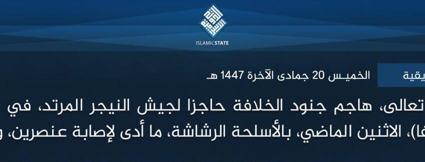 ولاية غرب إفريقية – بتوفيق الله تعالى، قتل جنود الخلافة جاسوسا للجيش النيجيري المرتد أمس، بالأسلحة الرشاشة، بعد أسره سابقا واغتنام سيارته قرب بلدة (غوبيو) بمنطقة (برنو)، ولله الحمد.