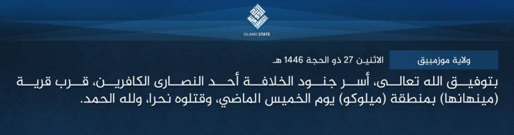 ولاية موزمبيق – بتوفيق الله تعالى، أسر جنود الخلافة أحد النصارى الكافرين، قرب قرية (مينهانها) بمنطقة (ميلوكو) يوم الخميس الماضي، وقتلوه نحرا، ولله الحمد.